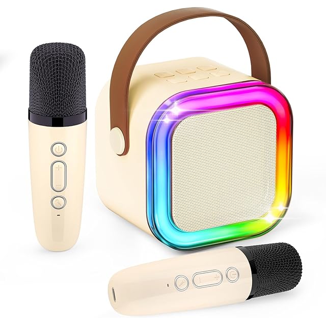 Verkstar カラオケセット Bluetoothマイク 2本 カラオケ スピーカー 家庭用 PAセット ワイヤレス マイク karaoke 無線マイク 多彩LEDライト付き エコー機能 伴奏機能付き 家庭カラオケ Android/iPhoneに対応 日本語取扱説明書 (Beige)
