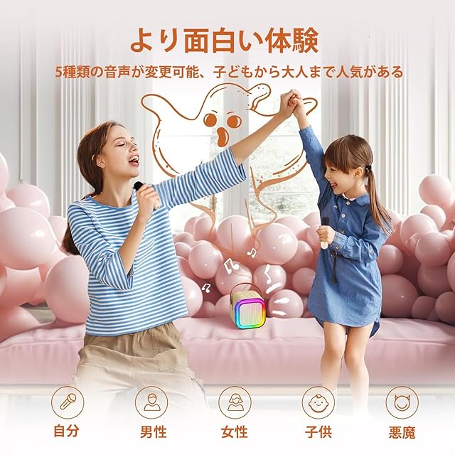 【シンプルで操作簡単】自分の音声、女性の音声、子供の音声、悪魔の音声、男性の音声という5種類の異なる音声が変更できるので、子どもから大人まで人気があります。エコー、再生音量なども自由に調節可能、お好みのサウンドをお楽しみいただけます。また、任意の曲からボーカルを除去/再開する機能も搭載し、音楽に合わせて自分の声を一緒に歌いましょう!