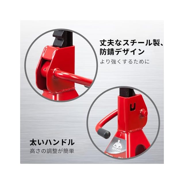 JACK BOSS 車用ジャッキスタンド 2t 2個セット 車馬 馬ジャッキ 8段階高さ設定 最低位250mm/最高位380mm リジットラック ウマ スチール製 タイヤ交換 レッド。 自宅の車メンテナンスに欠かせない製品!タイヤ交換やオイル交換などの作業時には欠かせないジャッキスタンドです。ジャッキスタンドは丈夫な高品質の鍛造鋼を使用し、溶接されたフレーム設計と防錆コーティングにより耐久性を高めています。ジャッキアップした車を支えるジャッキスタンドは4脚マットの設計で安定感を与えます。馬ジャッキの最大耐荷重は2トン、小型の個人車、オフロード車やバイクなどを取扱うことができます。初心者でも簡単に使用できます。初心者でも簡単に使用できます。作業によっては2台もしくは4台必要となります。使用しやすいように設計されており、レバーが上に上がると、ラチェットの高さを調整できます。持ち運びにも便利です。ガレージジャッキなどで持ち上げた車体を支え、より効率的な作業を行うことが出来ます。 4脚の支柱でしっかり支えるのでグラつきも無く安定感に優れています。頑丈で耐久性があるので、安心して作業をすることができます。 シンプルで丈夫で機能的なデザイン。 安全ロックシステム。 安定性を高めるための大きなベース。 長寿命で長持ちする耐久性のある構造。 頑丈な溶接構造。 ラックによる8段階の高さ調整。 趣味のワークショップに最適。 幅広の調節可能な足-作業場の床にやさしく、最大限の安全性を提供します。 片手レバーによる迅速な高さ調整。 パッケージは以下を含みます: ▪2xジャッキスタンド。 【注意事項】 絶対にジャッキの呼び荷重を超えた荷物を持ち上げないでください。 ジャッキの底面は常に固い、水平な平面の上に置いてご使用ください。 当商品は入荷の時期によりカラー/仕様などが変更される場合があります。予めご了承下さい。 入荷状況により細かな仕様変更がある場合がございますがご了承ください。 検品確認済みですので破損以外の交換には応じられません。商品到着時にはその場で開封、破損の有無を確認し、破損の場合には受け取らないか配送業者に申し出てください。