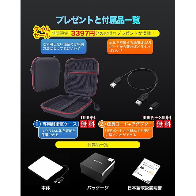 ●お得なプレゼントも満載:①DVD・CDドライブケース。安全・耐久性の良い素材を採用して、DVD・CDドライブをしっかり保護できます。内側に粘着的なストラップ付きで、ケーブル及びDVD・CDをよく固定できて落下の心配はありません。②延長コード。このUSB延長コードを使用すれば、USBポートから離れて接続することが便利に繋ぐことができます。