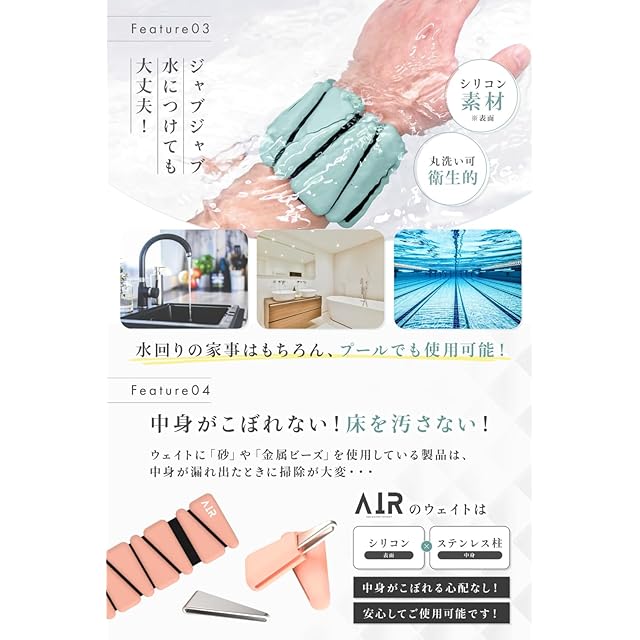 ✅【水中で使用可能】ウェイトに砂を使用していないため、水を一切気にせずご使用可能です。この特性により、皿洗い、お風呂掃除といった水回りの家事は勿論、プールでの水泳、ウォーキングなど水中での使用も問題なく可能となっております。
