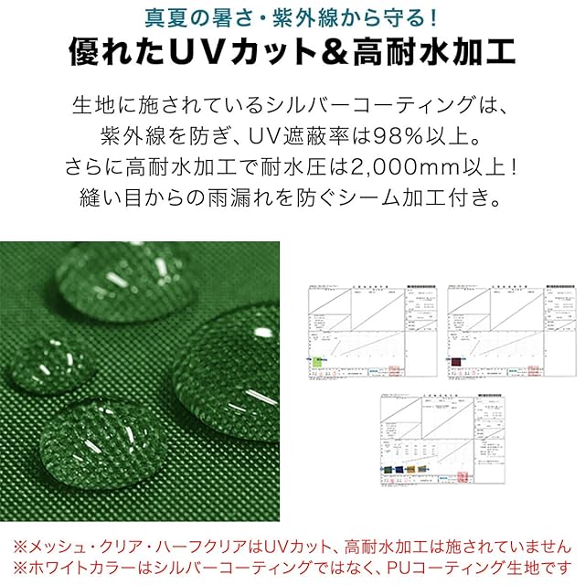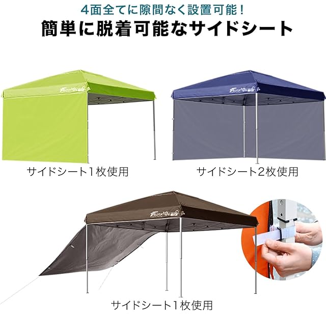 タープテント専用のサイドシート アルミ製・スチール製共通 3.0mタープテント専用のサイドシートです。 ラインナップは各カラーとメッシュ、そしてサイドシートをしたまま周りを見渡せるクリアとハーフクリアがラインナップ。 使用する環境や用途に合わせて選ぶことができます。 優れたUVカット&高耐水加工 生地には高耐水加工が施されており、耐水圧はなんと2,000mm以上! さらに、縫い目からの雨漏れを防ぐシーム加工が施されています。 そして、生地の裏面には紫外線から守るシルバーコーティングも施されています。 アウトドア・レジャーなど屋外で使用するには申し分ない仕様です。 カンタンに脱着可能なサイドシート トップカバーの裾の部分には、ファスナーが4面全てに装着されています。 これは、サイドシート(横幕)を取り付けるための仕様となっています。 サイドシートをトップカバー裾のファスナーに合うように設置し、 両サイドを面ファスナーで固定するだけで簡単にセットすることができます。 隙間なくサイドシートを繋げられる! 複数のサイドシートを使用する時、ファスナーで隙間なく繋ぐことができます。 連結部に隙間を作らないので、蚊帳のように虫除け対策にも最適。 ファスナーでカンタンに連結が可能 イベントなどで複数のタープテントを連結させたい時、サイドシートとサイドシートをファスナーで簡単に連結させることができます。 サイドシート同士を繋げるので、隙間なくキレイに繋げられます。