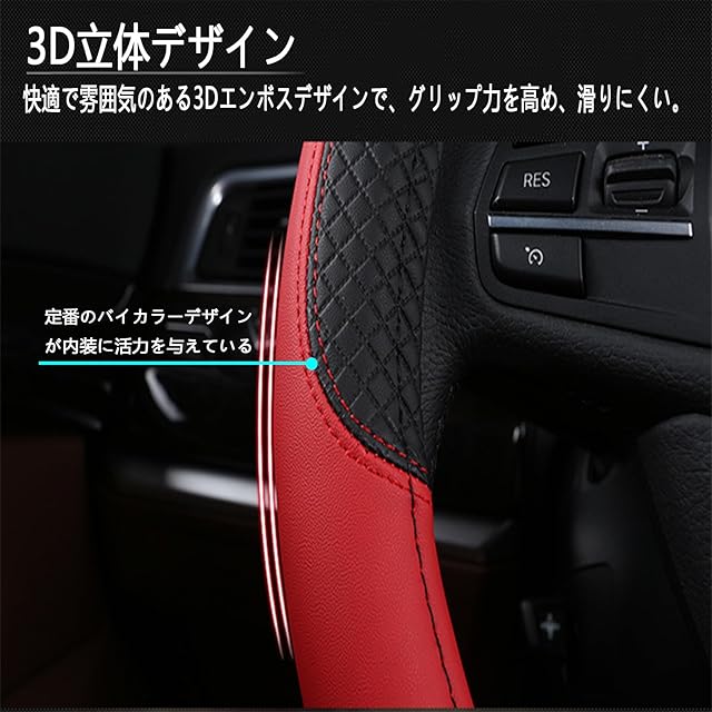 【高級感溢れるデザイン】スタイリッシュなデザインと機能性を両立したハンドルカバー。3Dダイヤモンド形状のデザインは滑り止め効果を高め、クラシックな2色のデザインは車内に活力を与え、スタイリッシュな外観と優れた工芸は愛車をより豪華にするだろう。
