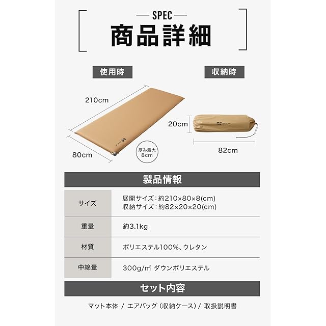 【厚みたっぷりのウレタン】最大8cmの極厚ウレタンがあなたの体をしっかりサポート。弾力性のある生地と相まって寝心地が更に向上いたしました。【自動膨張】バルブを開くと自動で空気が入ります!さらに高機能バルブを搭載した事で空気の逆流を防ぎ、より効率よく空気を取り込むことが可能に。 ※初回空気入れ時は出荷時の圧縮により空気の入りが遅く、時間がかかる場合があります。