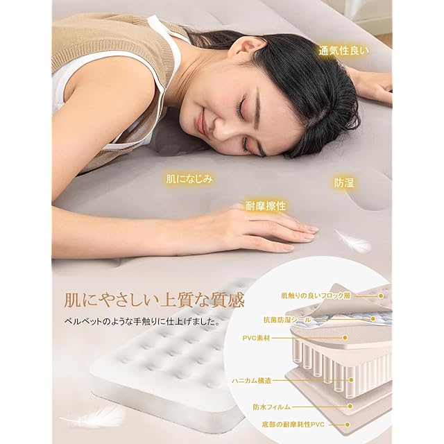【こだわりの素材&極上の肌触り】表面は肌に優しいフロッキー生地でできたから、ベルベットのような柔らかい手触りに仕上げました。まるで雲の上で寝ているかのような心地よさを提供します。中と底面には強靱で耐摩耗性のPVC素材を使用しており、滑り止めや優れた防水性があります。静電気を防ぎ、静かで寝返りを打っても煩わしい騒音はありません。高密度・高強度の強い耐久性があるため、アウトドアやキャンプ活動がもっと楽しくなるエアーベッドです。