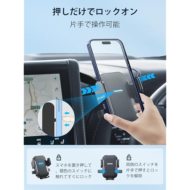 【押すだけ・使いやすい】:携帯ホルダーは歯車構造とリンク機構の組み合わせの押しボタンスイッチ、故障しにくく、非常に使いやすいです。 ①片手で側面のスイッチを押すとアームが開きます。②スマホを置きます。③スマホを少し押して後ろの銀色のボタンに触れ、0.1 秒でロック。アームと下部には厚い滑り止めマットあり、二重滑り止めでより強力な固定力を備えています。 高温差、耐食性、自由落下などのテストでも当社のアルファ40系携帯電話ホルダーは安定性、耐久性、安全性、利便性において優れた性能を持っています。