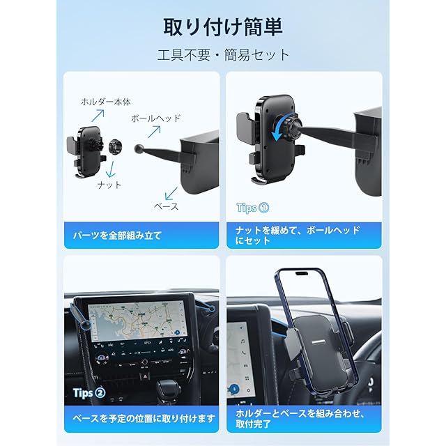 【日本車特別設計・安定性抜群】: Toyotaトヨタ アルファ/ウィルファ 40系 4代目(2023.6-現行モデル)(粘着耐震基部・高硬度・14インチ純正ナビ対応)(社外ナビ対応しません)iPhone/Android携帯電話4-6インチ対応(高さ8 -13.5 cm、幅 6.5-8 cm、厚さは1.5cm未満)(リンク式ケース対応不可)(2つのボールヘッド・左右装着可能)