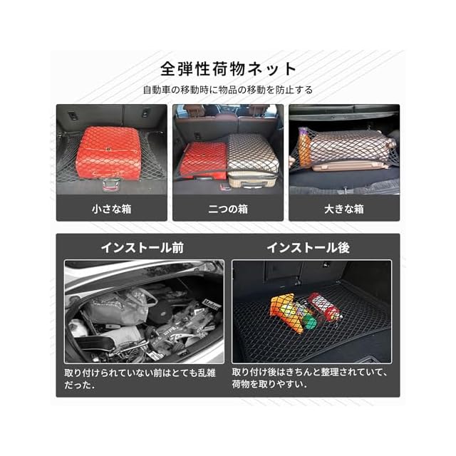 【適用車種&注意事項】乗用車、SUV、バン、トラックなどの類似車種に使用できます。荷物網は特殊な臭いがする可能性があります、風通しの良い場所で干してください、異臭を大幅に減らすことができます。