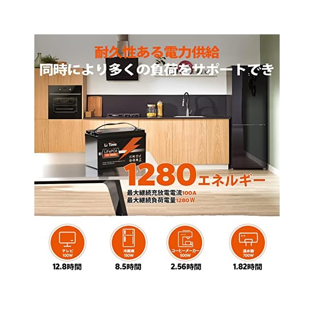 商品名:LiTime 12V100Ah リン酸鉄リチウムイオンバッテリー 1280W電力出力 100AのBMS 4000回以上サイクル回数 10年使用可能 コンパクトで軽量 BCIグループサイズ31 LiFePO4バッテリー 車中泊、キャンピングカーのサブバッテリー、ポータブル電源自作、ソーラー蓄電、バックアップ電源、オフグリッド自家発電、ボート、エレキモーター、エアーポンプに最適 日本語取扱説明書付き