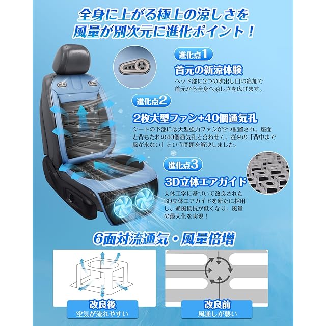 【2025最強進化版が新登場!】従来クールシートの欠点を踏まえて、弊社独自設計の風路、ファン、モーターの改良によって、風量が飛躍的に向上した!