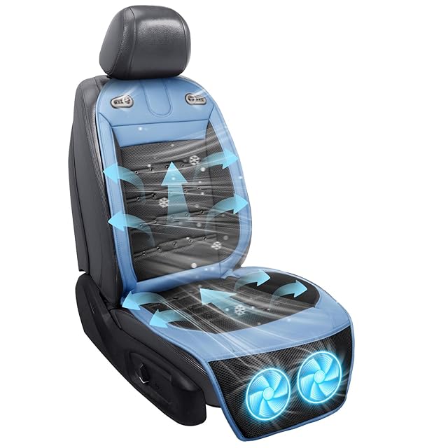 【革新版大型ファン2個搭載・40個通気ホール】従来品とは違い、独創した大型ファンは減音型モーターとファンブレードを搭載しており、パワフルな風を産み出しながら、動作音が約35dbに抑えられているので、運転の邪魔をしない。座面と背もたれの40個通気ホールと合わせて、エアコンの冷風が素早く吸われて環循させてお尻から腰・背中・首元まで広々なエリアに噴射!従来の「背中まで風が来ない」という問題を解決しました。