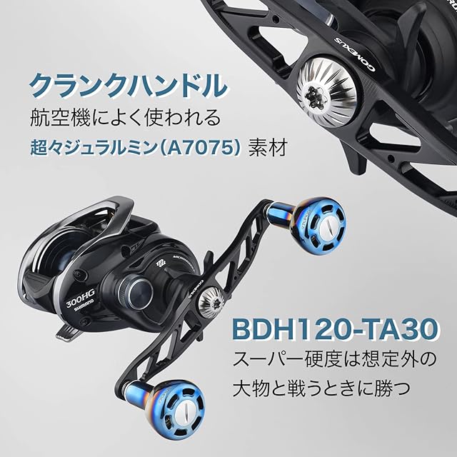 【製品仕様】ハンドル全体重さ:44.6g、ハンドル長さ:120mm、ノブ直径:30mm、ハンドル素材:A7075アルミ合金、ノブ素材:チタン、【付属品】ナット*2(左用*1、右用*1)、【対象魚】青物、ブリ、タチウオ、ヒラメ