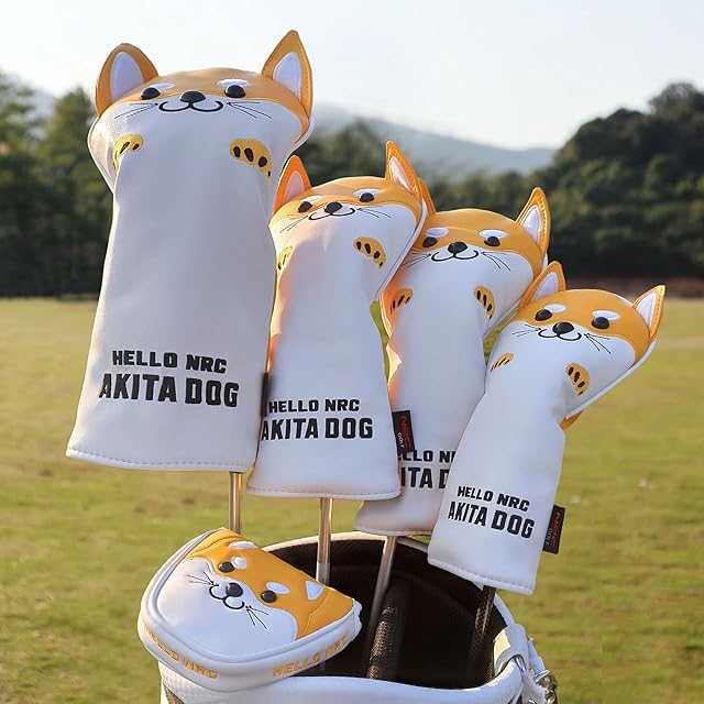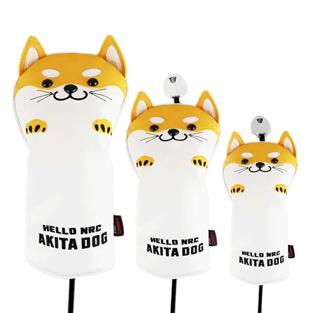 HELLO NRC ゴルフ クラブ カバー 秋田犬/チルト ネコ かわいい 黄 フード ウッド アイアン パター ハイブリッド カバー (DR/FW/UT) 調節可能 ラベル 460cc レザー 防水 防錆 プラッシュ PUレザー クラブ ヘッドカバー