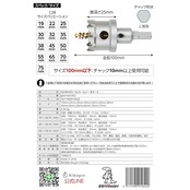 【スペック】[19~32(Φ・mm)]全長:100mm、有効長さ:25mm、適応板厚:12mm、シャンク径:10mm、ドリル径:6mm [35~55(Φ・mm)]全長:100mm、有効長さ:25mm、適応板厚:12mm、シャンク径:10/13mm(兼用)、ドリル径:6mm [65~75(Φ・mm)]全長:100mm、有効長さ:25mm、適応板厚:12mm、シャンク径:10/13mm(兼用)、ドリル径:6mm