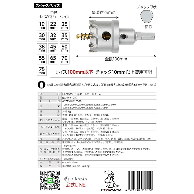 【口径サイズ】19mm,22mm,25mm,30mm,32mm,35mm,38mm,45mm,50mm,55mm,65mm,70mm,75mm 【スペック】[19~32(Φ・mm)]全長:100mm、有効長さ:25mm、適応板厚:12mm、シャンク径:10mm、ドリル径:6mm [35~55(Φ・mm)]全長:100mm、有効長さ:25mm、適応板厚:12mm、シャンク径:10/13mm(兼用)、ドリル径:6mm [65~75(Φ・mm)]全長:100mm、有効長さ:25mm、適応板厚:12mm、シャンク径:10/13mm(兼用)、ドリル径:6mm【軸形状]三面取 [本体材質]:13本[高速度鋼超硬40cr鋼鉄] [本体刃先]:13本[高速度鋼超硬YG9X硬質合金] [先端ドリル]:13本[高速度鋼超硬4341チタンコーテイング] [先端ドリル]:2本 [材質:コバルトM35] 【用途】ステンレス板、ステンレス管、アルミ板、FRP、鋼板、鋳鉄、銅管、中厚肉の鋼板、ほか 【適応機器】電気ドリル・ボール盤など※三つ爪チャックに取り付け可能 【ホールソー使用時の推奨回転数】被削材、ホールソーの直径により変わります。詳しくは推奨回転数の表をご覧ください。 ※穴あけする被削材、状況にあった回転数でご使用ください。 連続切削の場合には、低めの回転数を選定してください。