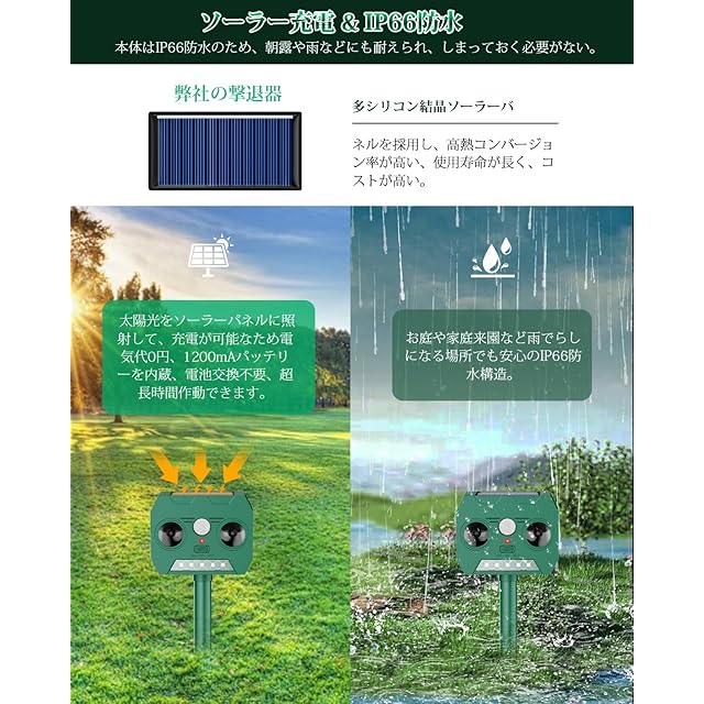 商品名:【2025新登場】動物撃退器 Oldstar 害獣対策器 害獣対策器 猫よけ 人気 鳥よけ 犬よけ 猫避け 15m感知範囲 LED強力フラッシュライト 赤外線センサー 二つ 超音波スピーカー ソーラー充電 超長待機 IP66防水防塵 超音波害獣対策器 差し込み & 壁掛け型 の 両用(グリーン)
