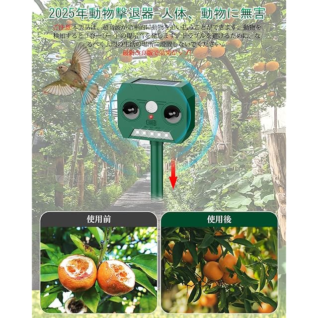 【2025機能の多様化 動物撃退器】害虫対策&無害&効果的。私たちの製品は、強い頻繁なフラッシュと超音波波を放出して動物を追い出すことができます。赤外線自動感知で害獣などを感知、感知すると超音波スピーカーで、30種類以上の動物が嫌がる超音波を発生。人体にも環境にも無害です!