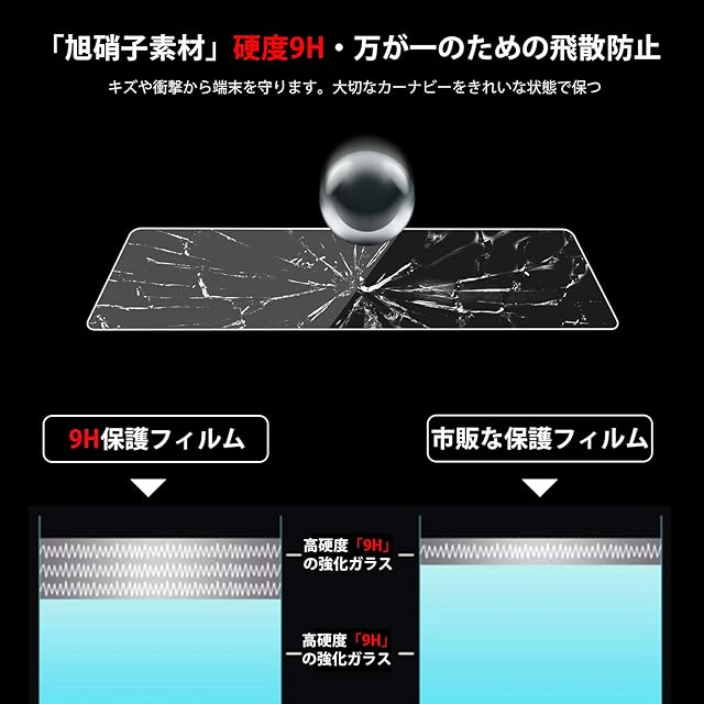 高硬度「9H」の強化ガラス:5つの層で薄くて鮮やかで強いガラスフイルムを実現。最近は液晶パネルに直接指でタッチしたりします、液晶画面は傷がつきやすいです。ナビ液晶を長く大事に使っていきたいなら、このカーナビ液晶保護フィルムをおすすめです。キズや衝撃から端末を守ります。