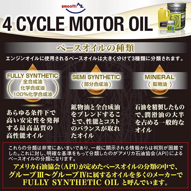100%化学合成油(VHVI/グループⅢ)をベースに、専用添加剤とエステルを用いた独自の処方により開発された高性能4サイクルエンジンオイル