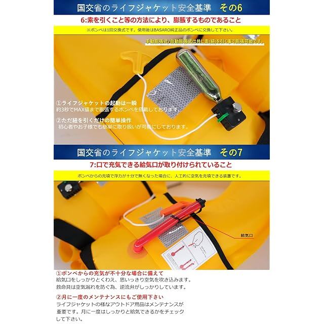 このフローティングベスト型のライフジャケットに搭載されているボンベは国際安全基準CNASの試験をクリアした製品です。ライフジャケットの保管は湿気の少ない風通しの良い場所で行って下さい。フローティングベストの上に物を置いて保管するなどはおやめください。またライフジャケットを着用しない場面でライフジャケットの上に座ったりすると製品が破損する原因となりますので、ご注意下さい。