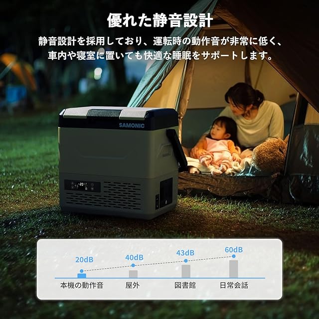 【低電圧保護機能&静音設計】この車載冷蔵庫には3段階の電圧保護機能があり、車のバッテリーの電力が不足すると自動で電源を切り、車のバッテリーの寿命を延ばします。また、静音設計により、動作音は43dB未満で、静かに運転でき、休息中でも動作音が気になりません。