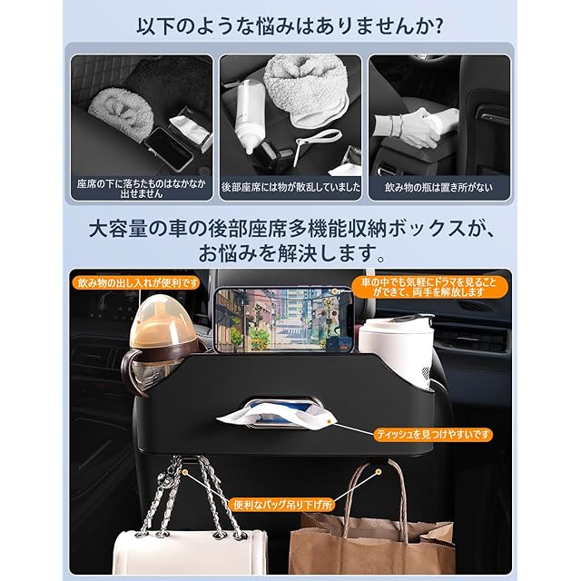 【車用多機能収納ボックス】この車の後部座席多機能収納ボックス、乱雑なものに別れを告げ、きれいな旅行を実現するのに役立ちます。異なる機能区画に格納されていて、整理が容易です。ティッシュ、コップ、子供用の瓶、吊り袋は全部保管できて、とてもアクセスしやすく、子供連れ旅行の必需品です。カップホルダーの位置は携帯電話、コイン、カード、鍵、財布、充電器を保管するためにも使えます。スペースを節約して、あなたの車の清潔さと便利さを維持します。