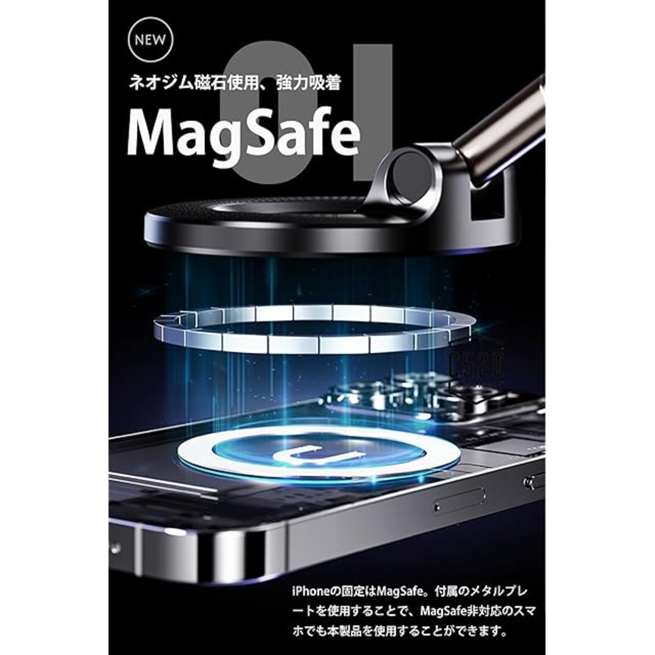 【手動式の真空吸盤】 最新型の真空吸着とMagSafeを組み合わせた次世代のスマホマルチスタンド。真空吸着は手動で、土台の部分を時計回りにカリカリと回転させるだけでONに。真空の力で、凹凸のない壁などの平面に簡単に吸着。最大5kgまで耐える強力な吸着力で、スマートフォンの落下も心配ありません。真空状態は反時計回りに回せば一瞬で解除されます。従来の自動真空吸着は、動作音が大きく誤作動が多いという問題点がありましたが、本製品は手動式にすることでこれらの問題を解決しました。 【MagSafeで固定】スマートフォンの固定はMagSafeマグネット。付属品のメタルプレートを使用すれば、MagSafe非対応のスマートフォンでも本製品をご使用いただくことができます。 また、磁力がはたらく場所であれば、MagSafeマグネット面を壁に吸着させて、真空吸盤でスマートフォンを固定することも可能です。 表裏、用途や使用場面に合わせて、お好みで使い分けてください。 【折り畳み式のスタンド】伸縮ができる角度調整可能なスタンドを搭載。使用時は高さ12㎝となり、折り畳むことで、約4㎝までコンパクトにすることができます。 持ち運びにも便利なため、車はもちろん、オフィス、寝室、キッチン、ジム、旅先など、さまざまな場所で活躍します。 ヒンジ支柱は真ん中で360°回転が可能。上下左右にお好みの角度でご使用いただくことが可能です。 【付属の補助プレートでどこでも吸着】 真空吸盤の弱点である、凹凸のある場所への吸着も、付属の補助プレートで解決! 凹凸のある平面でも、この補助プレートを貼付すれば、真空吸着させることができます。 さらにその補助プレートの粘着テープは固定が強力な3M社製。粘着が外れて落下するおそれもありません。 【製品仕様】サイズ:直径60x高40㎜、重量:約90g、付属品:本体、補助プレート、メタルプレート、清掃シート、取扱説明書 【注意事項】 ※日本語取扱説明書は付属していません。付属している取扱説明書は英文表記となります。商品ページを参考にしてご使用ください。 ※本製品は充電器ではございません。※スイッチをOFFにせず無理に外す行為はお控えください。故障の原因となります。※ヒンジの固さ調整は不可です。