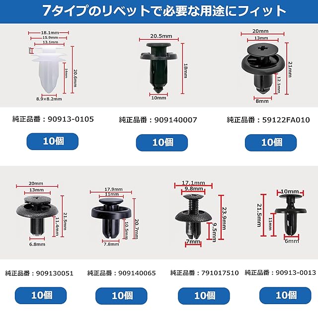 -【豊富なセット内容】70個入り(7種類のサイズ混合)+ 収納ボックス+ 取り外し工具付 (5種類) 。穴径 6mm/7mm/8mm/10mmなど、使用頻度の高いサイズを豊富にラインナップ。純正品番: 90913-0105, 909140007, 59122FA010, 909130051, 909140065, 791017510, 90913-0013