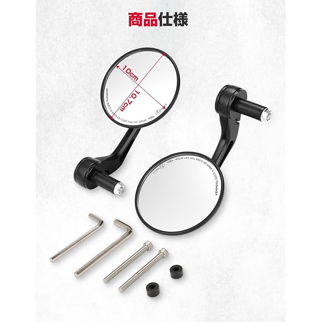 【汎用性高い】ハンドル径16.5mm-22mmのバイクに適合するバーエンドミラーです。様々な車種を対応できます。購入前にご愛車のハンドルの内径を確認してください。【車検対応】バーエンドミラーの鏡面直径は100mmで、面積が79平方センチメートルで車検/安全基準に対応されます。