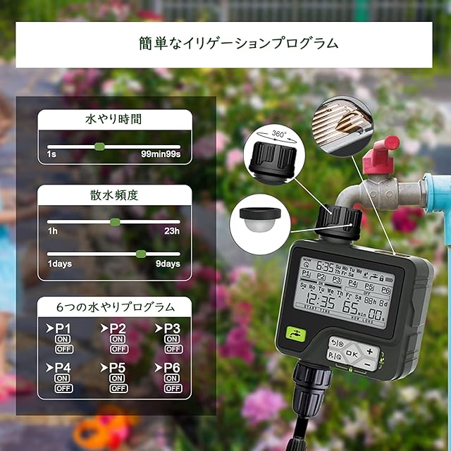 自動散水タイマー 散水ホース 植物灌水 散水システム 散水用具 灌漑システム 給水 観葉植物 6つのプログラム可能な手順を備えたウォータータイマー雨遅延/手動/自動モード、芝生庭の灌漑用(グレー)