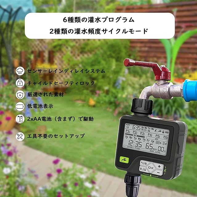 「スマート灌漑システム」:手動モードでは、予約された灌漑手順を中断することなく灌漑を即座に使用できます。雨遅延モードでの変化。これにより、灌漑プログラムを一定期間一時停止して、水を摂取しないようにし、不必要な廃棄物を避け、大量の水を節約できます。 雨の日に。 チャイルドロックモードは、スプリンクラータイマーが子供やペットの活動に誤って触れられないようにします。
