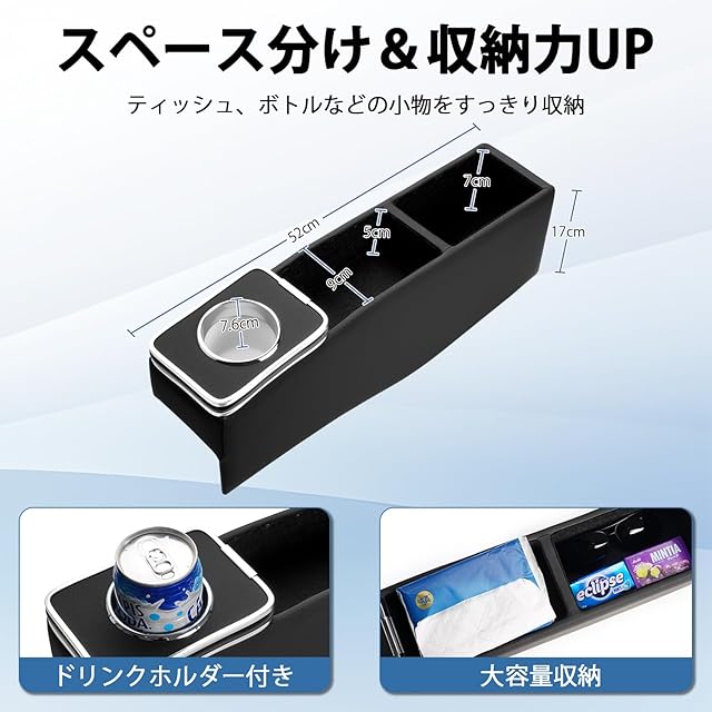 3.「収納力UP」:サイズにより、いくつかの大容量の収納スペースを備え、ティッシュ、カードなどの色々な小物が収納可能だけでなく、ドリンクホルダーを増設し、ボトルなどの小物入れとしても大活躍。限られた空間を有効活用して、快適なドライブ空間を実現する。