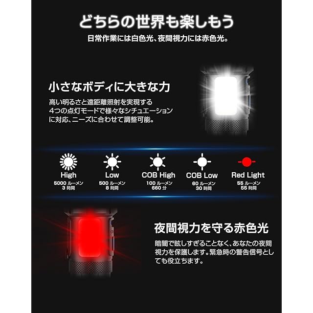 <b>商品特徴</b><br> ・最新P160 LEDを搭載し、超高輝度を実現。500メートル先まで明るく照らします。<br> ・7つの点灯モード(高輝度、低輝度、点滅、COB白灯高輝度、COB白灯低輝度、COB赤灯、COB赤灯点滅)を簡単に切り替え可能。<br> ・大容量バッテリーを搭載し、COB作業灯で最大30時間、高輝度モードで約3時間、低輝度モードで約5時間使用可能。<br> ・USB Type-C充電対応で、素早く充電できます。<br> ・高品質アルミ合金製で、IPX6防水性能を備え、過酷な環境でも安心して使用できます。<br> ・航空宇宙グレードのアルミニウム合金を使用し、2メートルの高さからの落下にも耐えられる耐衝撃性。<br> ・ストラップ付きで持ち運びが便利。コンパクトなサイズで片手で簡単に操作可能。<br> ・電池残量表示機能付き。4段階のLEDインジケーターでバッテリー残量を一目で確認できます。<br> ・パッケージ内容:本体×1、充電池×1、USB充電ケーブル×1、バッテリーケース×1、ストラップ×1、日本語取扱説明書×1。<br><br>