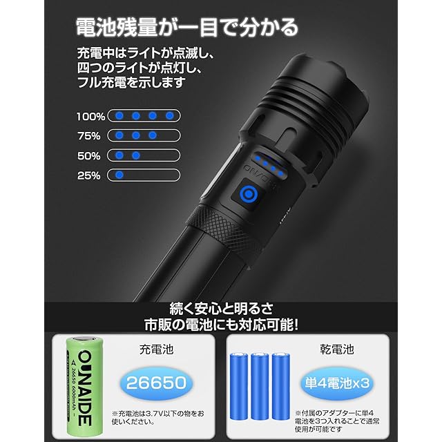 【長時間使用・Type-C充電式、乾電池式両用】大容量の26650充電式バッテリー付き。汎用性の高い単四乾電池式と充電式の両用タイプですので、夜の散歩など日常用は充電して使えて経済的、避難先までの移動など防災時は乾電池で長持ち、電池さえ交換すれば、再び長時間使用できます。USB Type-C充電対応で素早く充電でき、バッテリー残量はインジケーターで一目で確認できるため、充電のタイミングがわかりやすく電池切れの心配はないです。