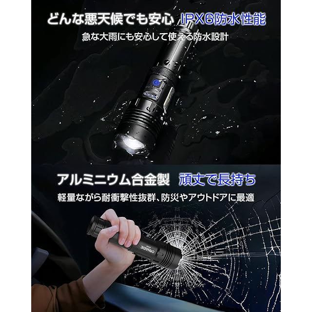 ☔【軍用級耐久性・IPX6防水性能】フラッシュライトの外装は強度が高く、落としても割れにくいアルミニウム合金製。ストラップもついているので、落下による破損も防げます。IPX6防水性能を備えて、台風など雨の日でも使用可能です。重さが180g(電池抜く、263g電池込み)、長さが17cm、比較的小型で持ち運びやすい、長時間使っても疲れにくいです。