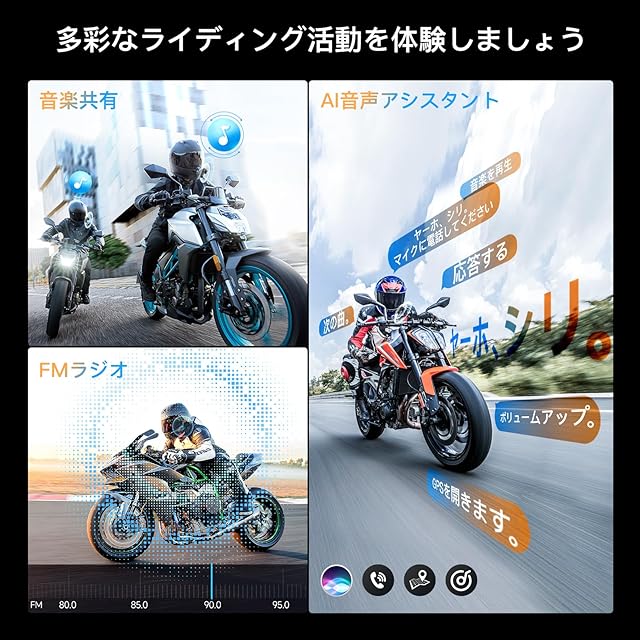 【単独でもペアでも、退屈なライドとはお別れ】内蔵FMラジオ(87.5-108MHz対応)が、長距離ツーリング中のエンターテインメントを提供。音楽シェアモードでは、相棒や同乗者、グループと音楽を同期再生でき、旅をより楽しくします。一人でも仲間とでも、H2Eオートバイコミュニケーションシステムが冒険を盛り上げます。