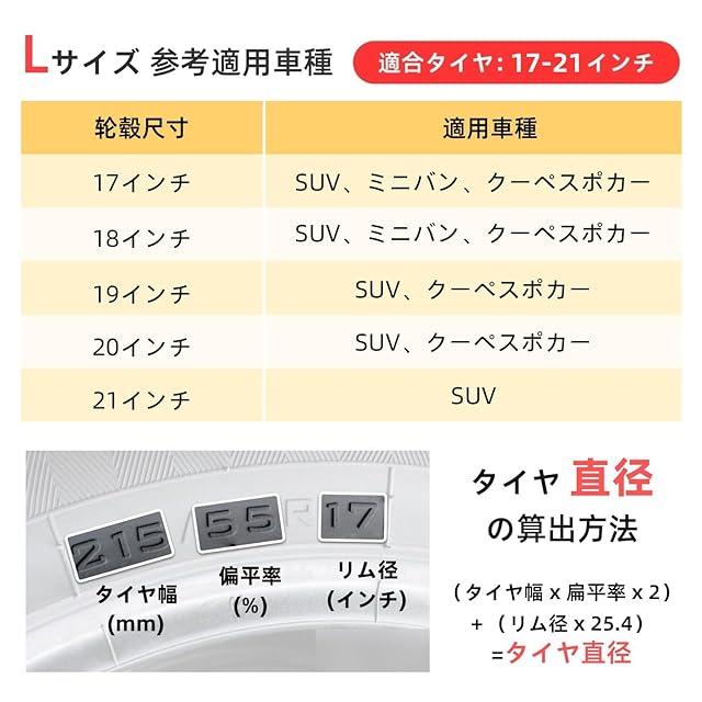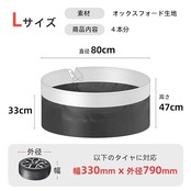 【耐久性に優れた素材】Lサイズ:直径80cm x 厚み47cm、適合タイヤ:17~21インチ。素材:高密度ポリエステル100%(300D+210T)。収納袋:長い28cm × 幅25cm × 高さ6cm。防水、防紫外線、防塵機能を備え、長期間使用しても破れにくく劣化しにくい設計です。