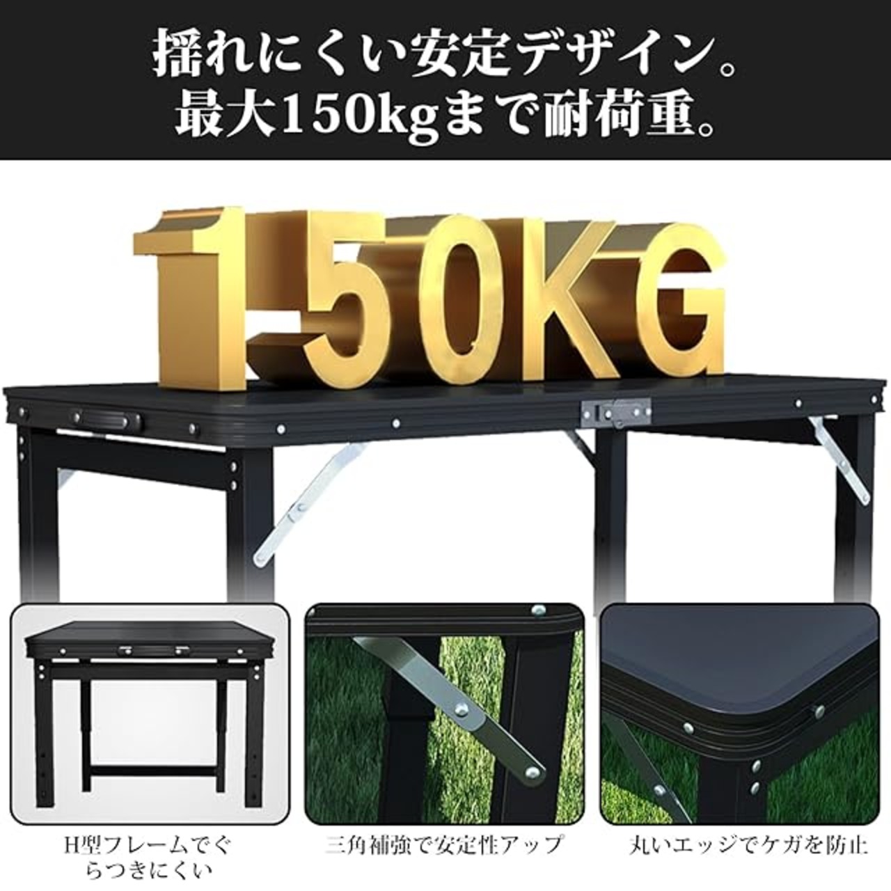 【高耐荷重&安心設計、レジャーシーンにも最適】 H型フレームと三角補強で耐荷重150kgの強度を実現。安定感があり、大人が複数人使っても安心です。天板の角は丸く加工されており、お子様のいる家庭やレジャー キャンプ用としても安心して使えます。