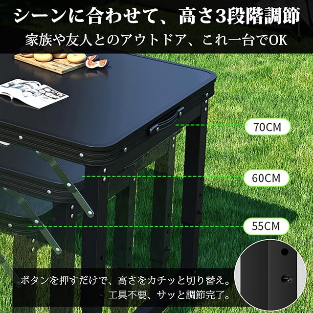 【高さ3段階調節、シーンに合わせて使えるキャンプテーブル】 テーブルの高さは55cm/60cm/70cmに調整可能。家族との食事やお子様の作業台、アウトドアでの調理など、シーンに応じて最適な高さで使えます。ボタン式で切り替えも簡単。キャンプ テーブルとしてもぴったりな設計です。