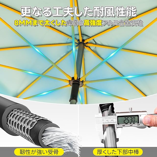 「風に強い15角形ポール」:①従来の釣り用パラソルより太い「8mm」のグラスファイバー傘骨を採用、靭性が高く、鉄製より約10倍の引っ張り強度を達する。②ポールは最新改良した「15角形」を使用したことで、突風の力をより効果的に分散し、壊れにくいパラソルです。