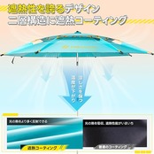 「遮熱コーティング」:パラソルの裏面には遮熱コーディングが施されており、黒コーディングよりは多くの熱を反射することができます。二層式で、通気性に優れており、熱が篭らず、炎天下でも涼しい空間で楽しくお釣りができます。