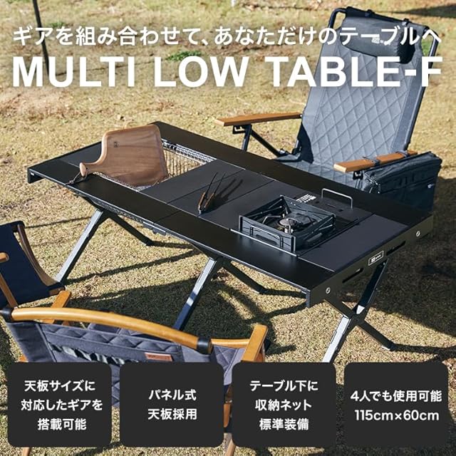 洗練されたBLACKカラーで、ギアを組み合わせてあなただけのテーブルへ【WAQ MULTI LOW TABLE-F】マルチな機能が詰まったテーブル・ファミリーまで対応可能な115cm x 60cm・天板サイズに対応したギアを搭載可能・アルミ製パネルとウッドフレームの組み合わせ・小物の収納に便利な収納ネットをテーブル下に標準装備