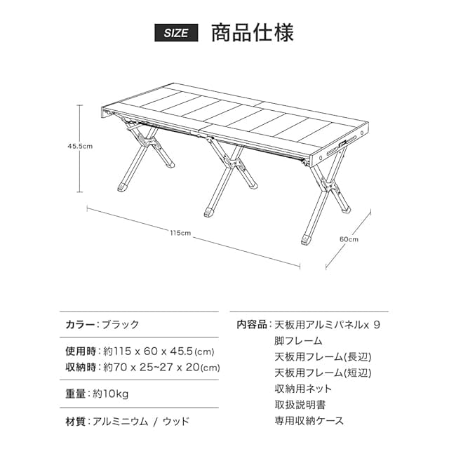 【商品仕様】「カラー」ブラック「サイズ」使用時:約115 x 60 x 45.5cm収納時:約70 x 25 x 20cm「重量」約10kg「材質」アルミニウム/ウッド「内容品」テーブル本体 / 収納ネット / 収納袋 / 日本語説明書