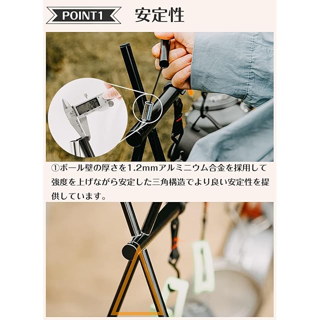 【高強度素材・安定性アップ】本体のポール壁の厚さを1.2mmアルミニウム合金を採用して、強度を上げながら安定した三角構造でより良い安定性を提供しています。ハンギングラックの長さと幅のサイズを改良することにより、多くの物を吊るすことができる上に、三角構造の角度も変わってきて、最も安定な構造になります。