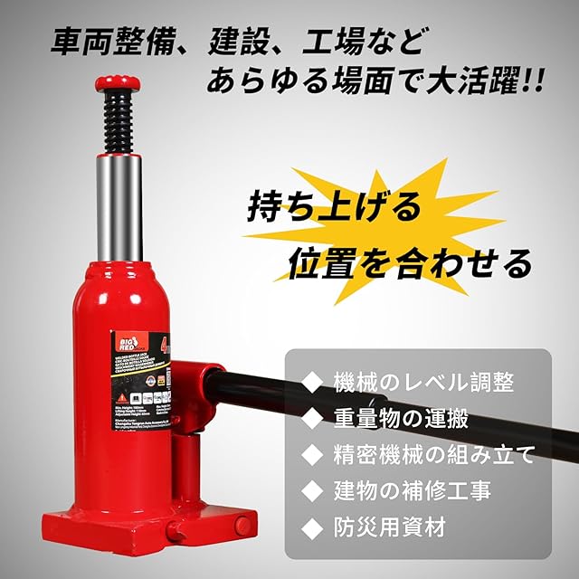 商品名:BIG RED ダルマジャッキ 4t 油圧式 ボトルジャッキ 最低位180mm/最高位350mm 軽量 スチール製 耐荷重4トン 車用 車整備 タイヤ交換 レッド TJ90404D