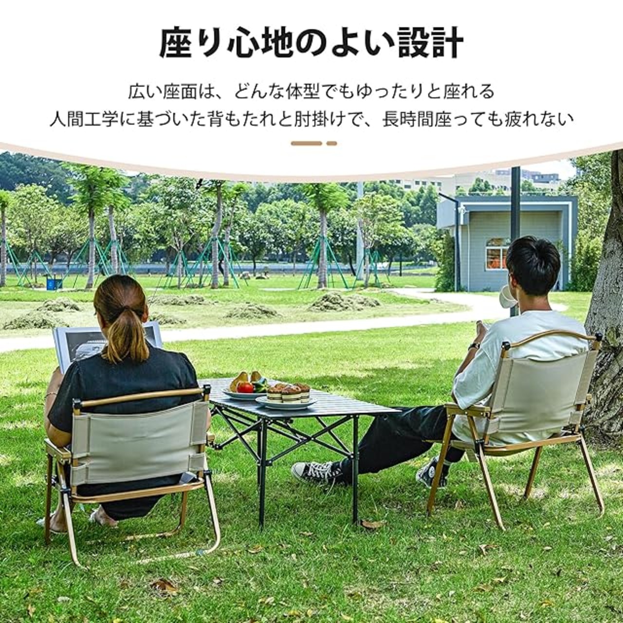 【快適な座り心地】 幅52cm、奥行き52.5cm、座面高さ40cmと、ゆったりとしたサイズ感で座りやすいデザイン。背もたれは78cmと十分な高さがあり、リラックスしながら座ることができます。どんな体格の方にもフィットするキャンプ椅子です。