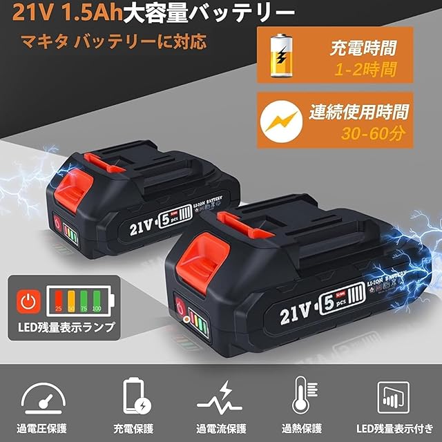【商品仕様】マキタ 互換 18v バッテリー 充電器セット 型番:LNCMR18650 5S1P 電圧:21v 容量:1500mAh 種類:リチウムイオン電池 個数:2個 21v バッテリー、充電器付き AC100v-220v LEDランプ残量表示+自己故障診断、着脱方式:スライド式 安定性に定評の高品質モデル、 容量アップ、1.5Ahの高容量なので、電動工具が長い時間作業できます。