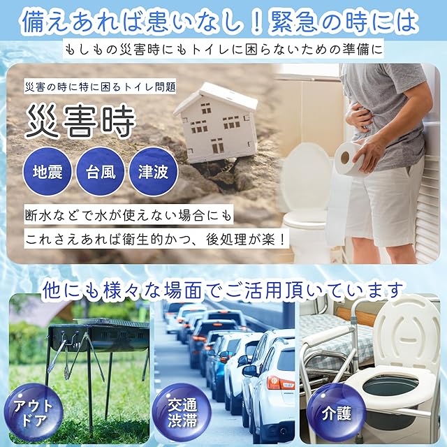 【万が一の事態への備えや日常使いも】断水や停電、災害時などトイレで水が使えない時にあると便利なセットです。このセット1つで4人家族の約3日分が賄えます。コンパクトな箱に必要なものを集めたセットでこれさえあればもしもの時のトイレに困りません。キャンプや介護、怪我の時でも使えます。トイレの設備がない場所でのキャンプやトイレまでの移動が難しい介護や怪我をしている場合でも簡易便座(このセットには含まれません)と組み合わせることで仮設のトイレができます。