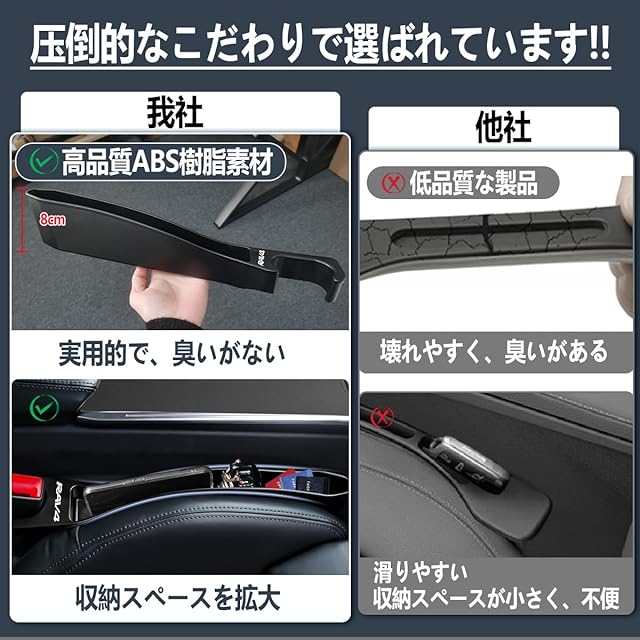 ✅【大容量収納&落下防止】 座席の隙間に落ちた鍵や携帯電話を探し回る手間を解消!8cmの深さを持つ広めの収納スペースで、鍵、携帯電話、財布、イヤフォンなど、日常的に使うアイテムをしっかり収納できます。他の隙間クッションより広いスペースを提供し、車内をスッキリと整理整頓。座席の隙間を有効活用し、落下防止機能で安全で快適なドライブをサポートします。【適用車種】トヨタ RAV4などに対応。