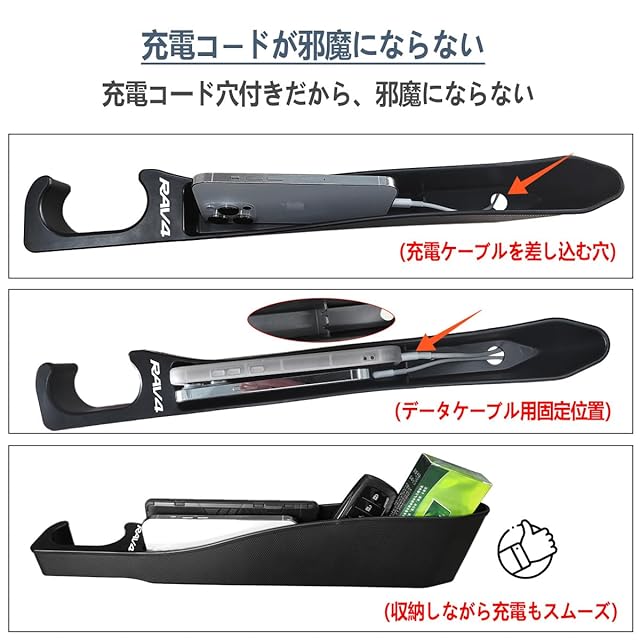 【充電対応の便利設計】 専用の充電穴で、収納したまま携帯電話を充電可能!電ケーブルが絡まる心配もなく、車内をスッキリ保ち、ドライブ中のストレスを軽減します。快適なカーライフを実現します。